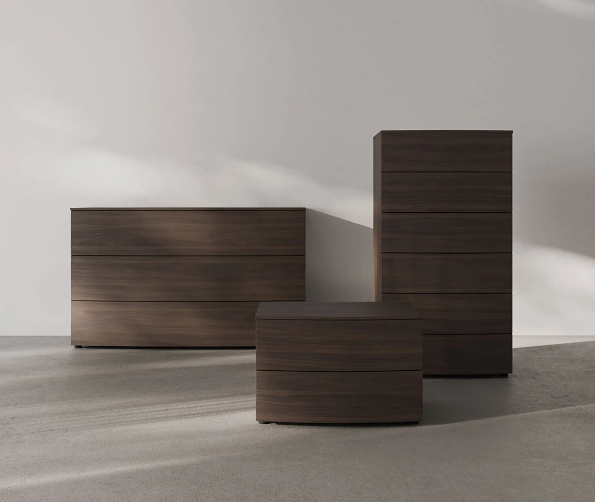 Una ricca gamma di cassettiere Orme: i comodini moderni in melaminico, come Gruppo Notte Onda, sono tra le soluzioni più originali.