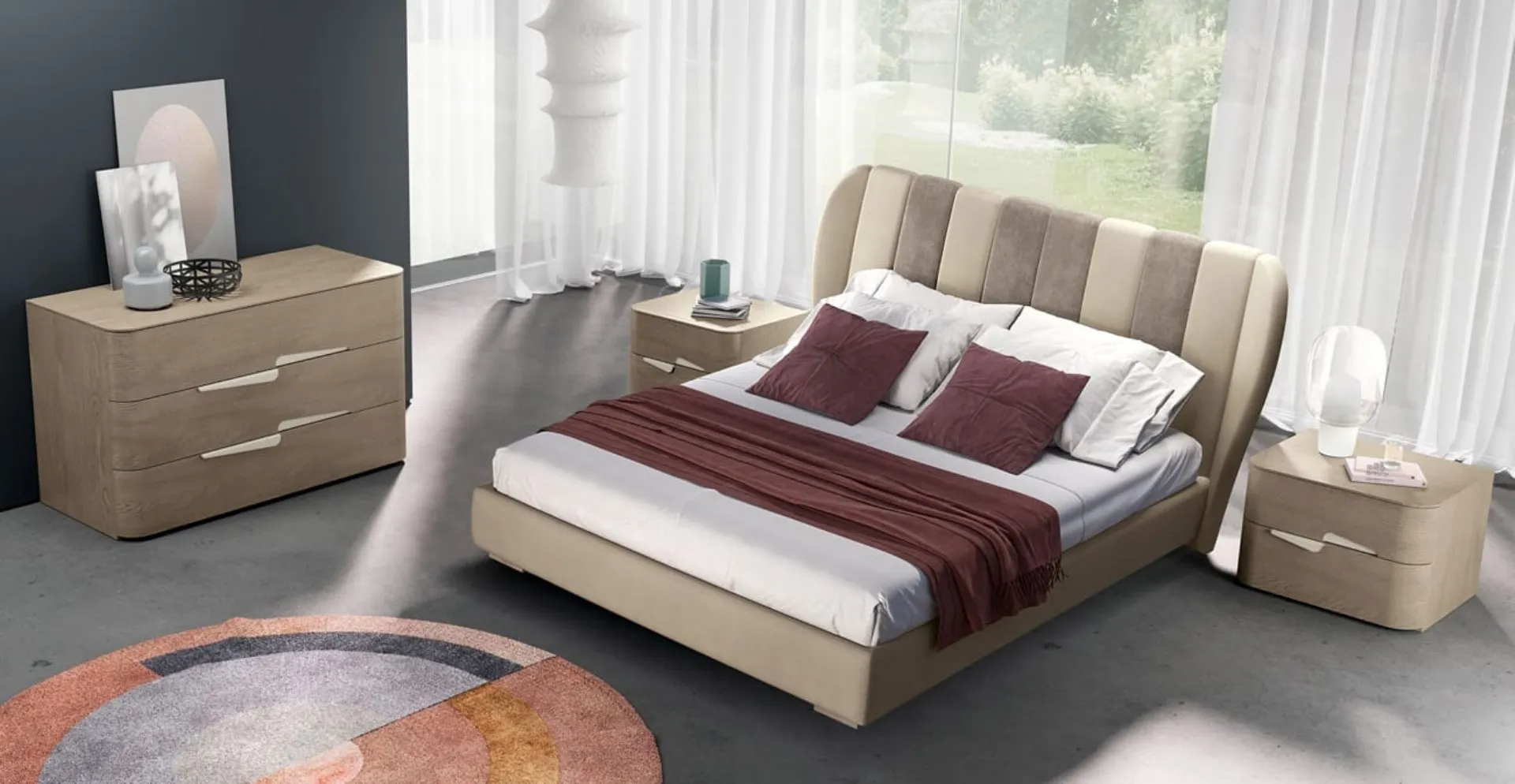 Vuoi ammobiliare la zona notte con Comodini e cassettiere di Adriatica? Eccoti il modello Gruppo Notte Over in legno per spazi design.