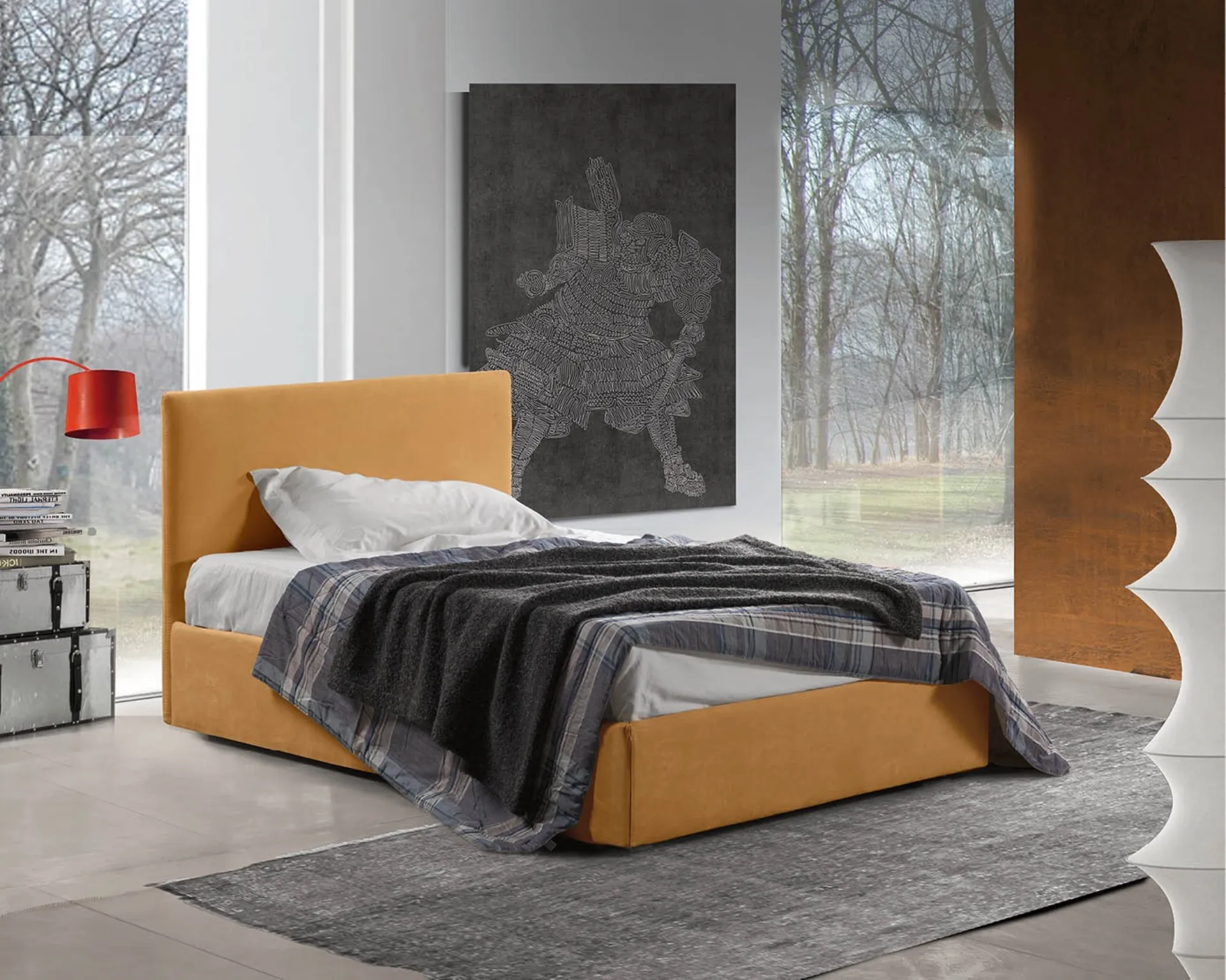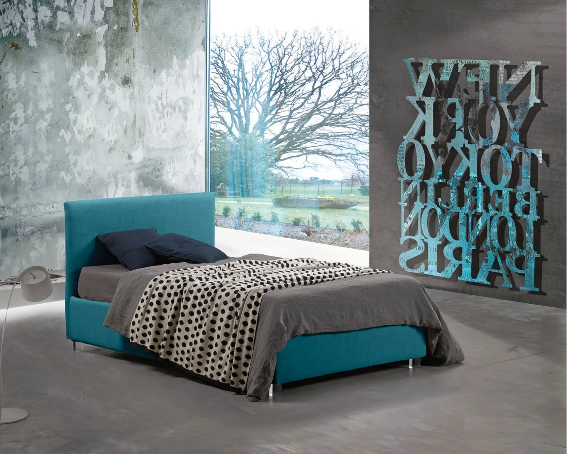 Il letto singolo Perseo in tessuto nell'immagine, tra i modelli imbottiti moderni di Lettissimi , è pensato per garantire il relax totale.