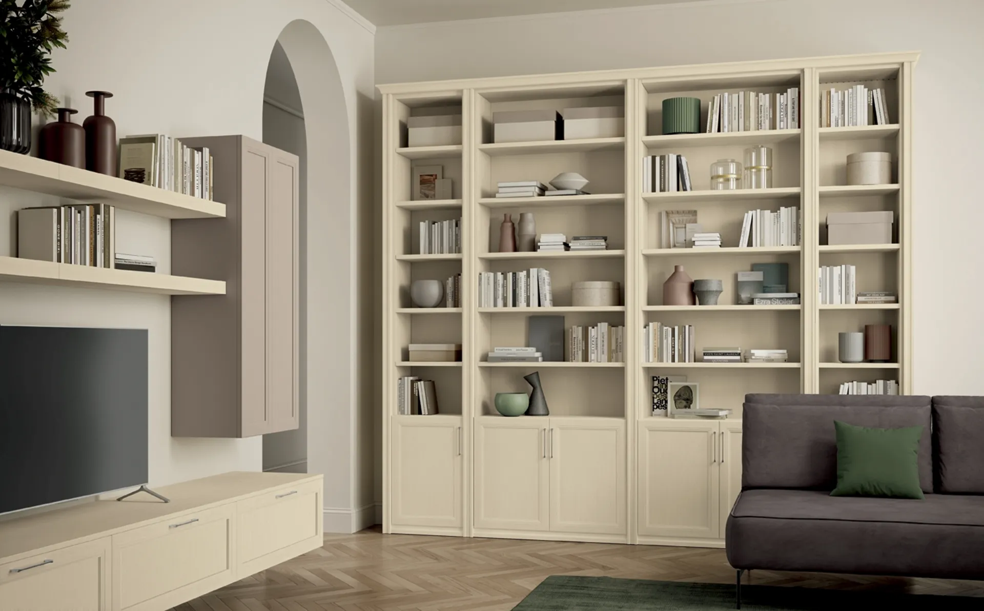 Vuoi ristrutturare il soggiorno? Scopri di più sulle librerie classiche a muro e arreda i tuoi spazi con il modello Arcadia AS004.