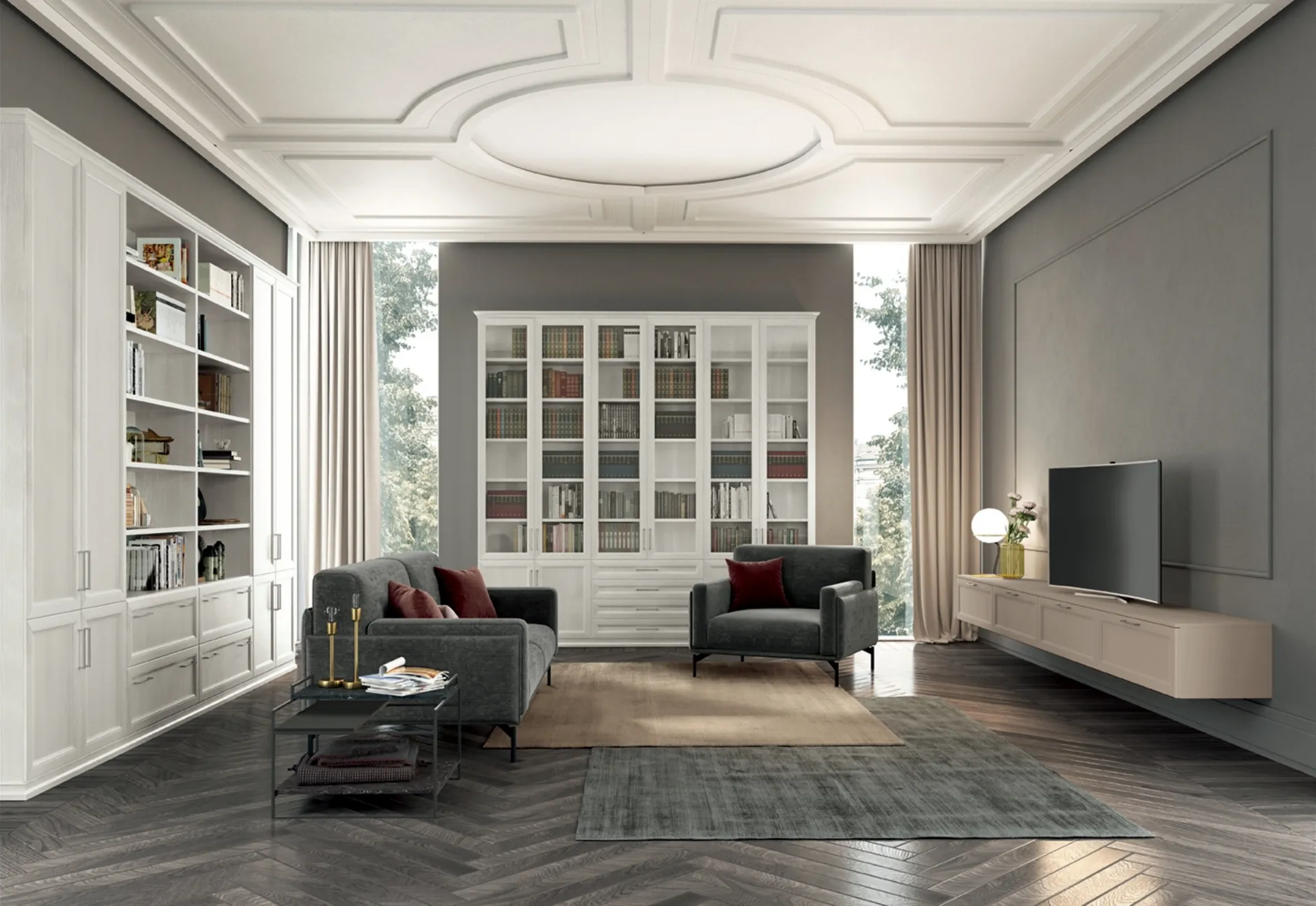 Librerie a muro iper funzionali per stanze classiche: scopri di più sul modello Arcadia AS006 della marca Colombini Casa!