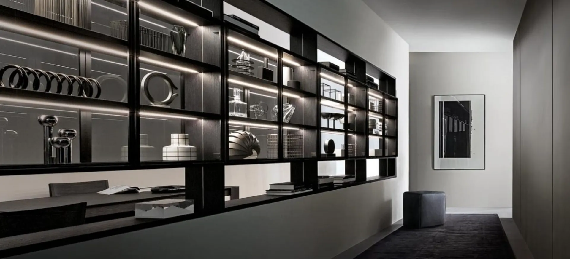 Materiali di pregio e forme decise: scopri la libreria Flexus composizione 11 di Giellesse tra le più originali Librerie classiche divisorie.