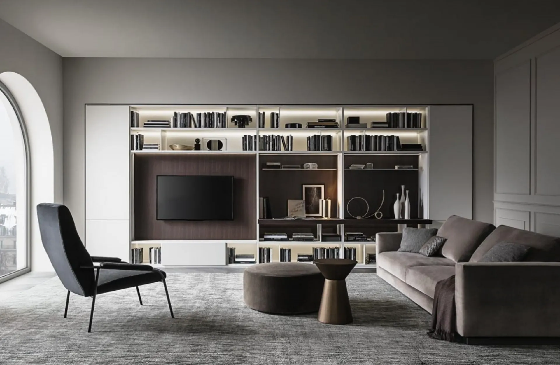 Texture di pregio e linee decise: scopri la libreria Flexus composizione 09 di Giellesse tra le più originali Librerie moderne a muro.