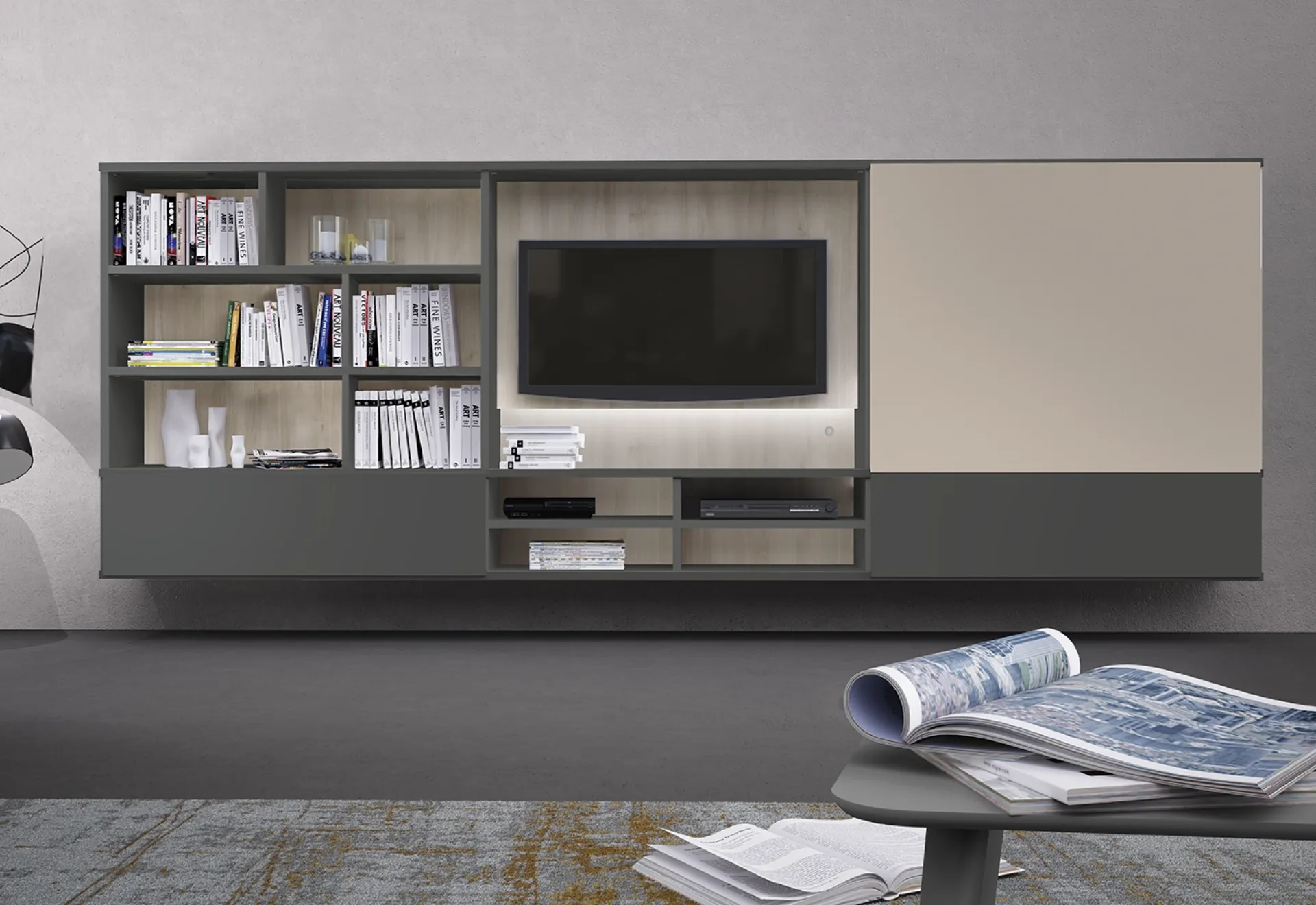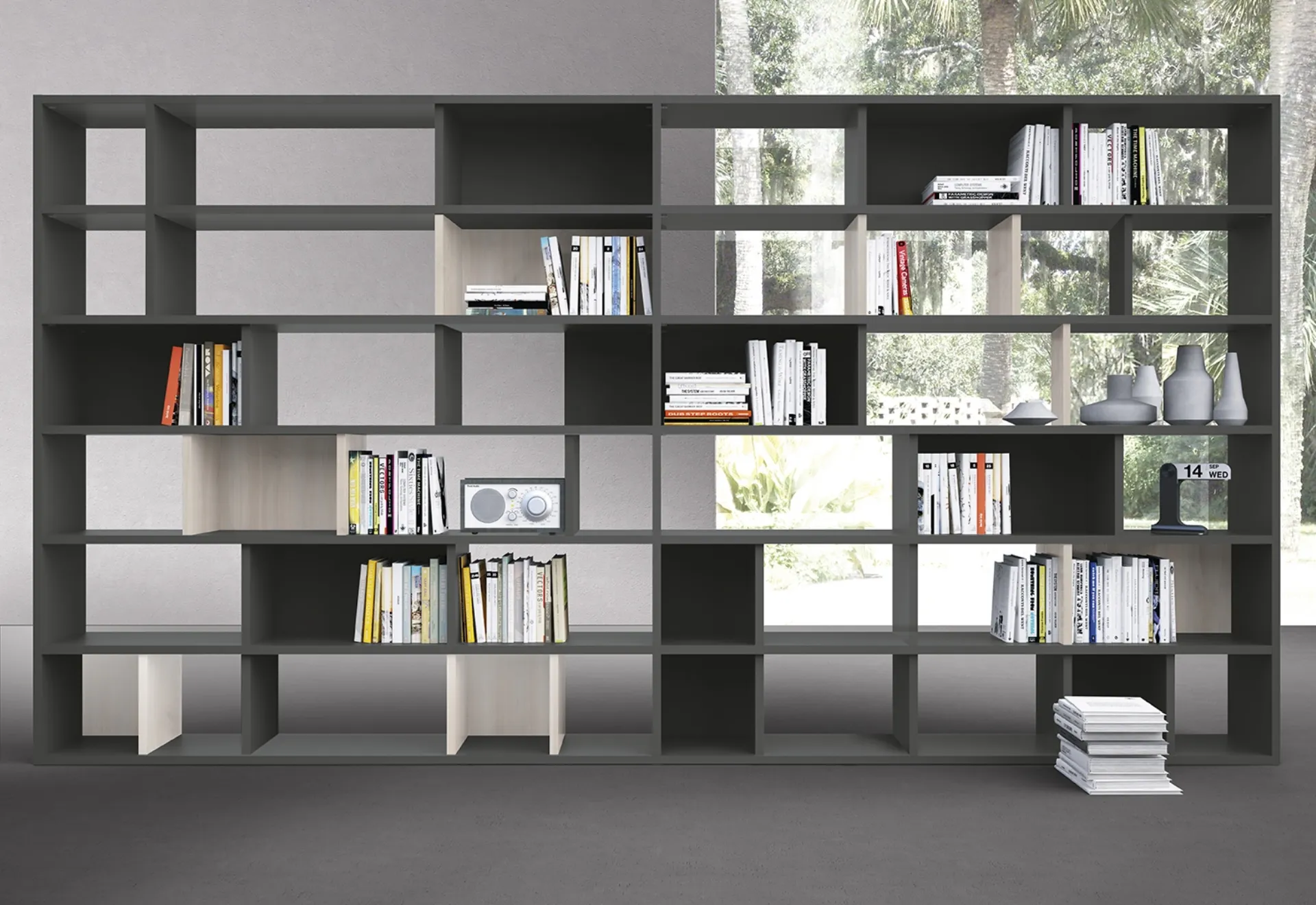 Texture di pregio e forme decise: scopri la libreria Infinity L24 di Colombini Casa tra le più originali Librerie moderne componibili.
