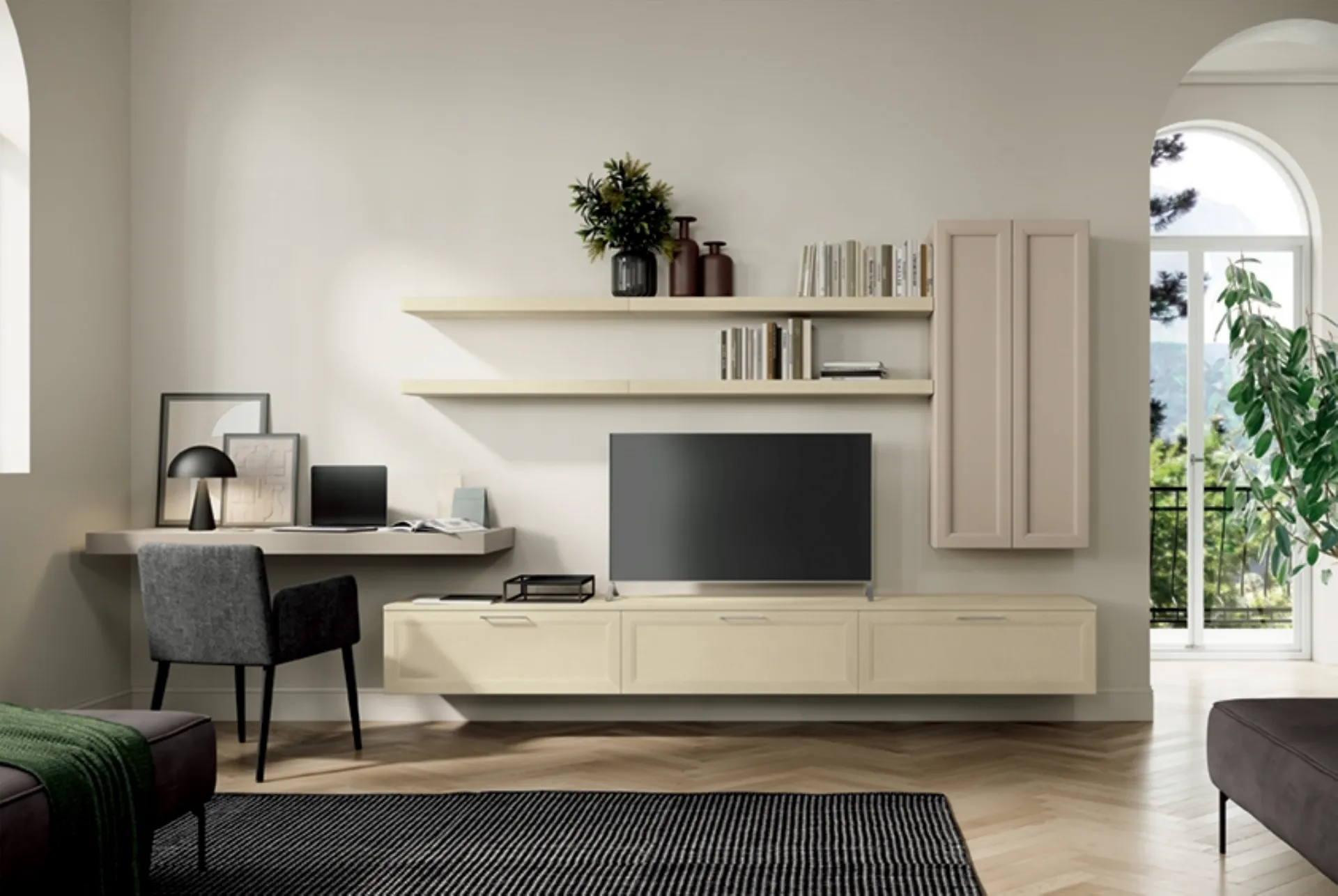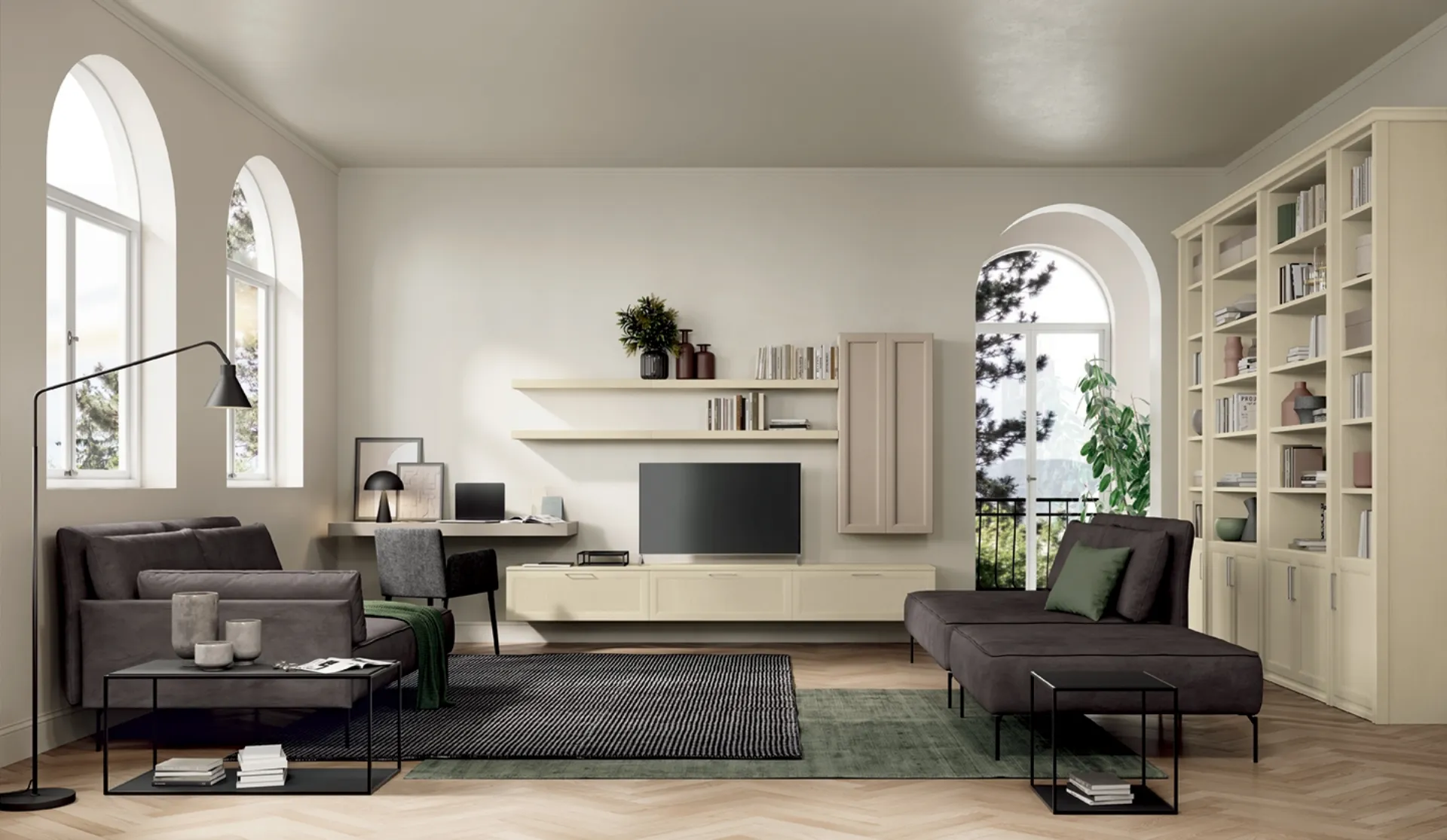 Se vuoi ultimare un soggiorno dinamico e operativo dalle linee classiche, ti offriamo la parete attrezzata Arcadia AS004 Colombini Casa.