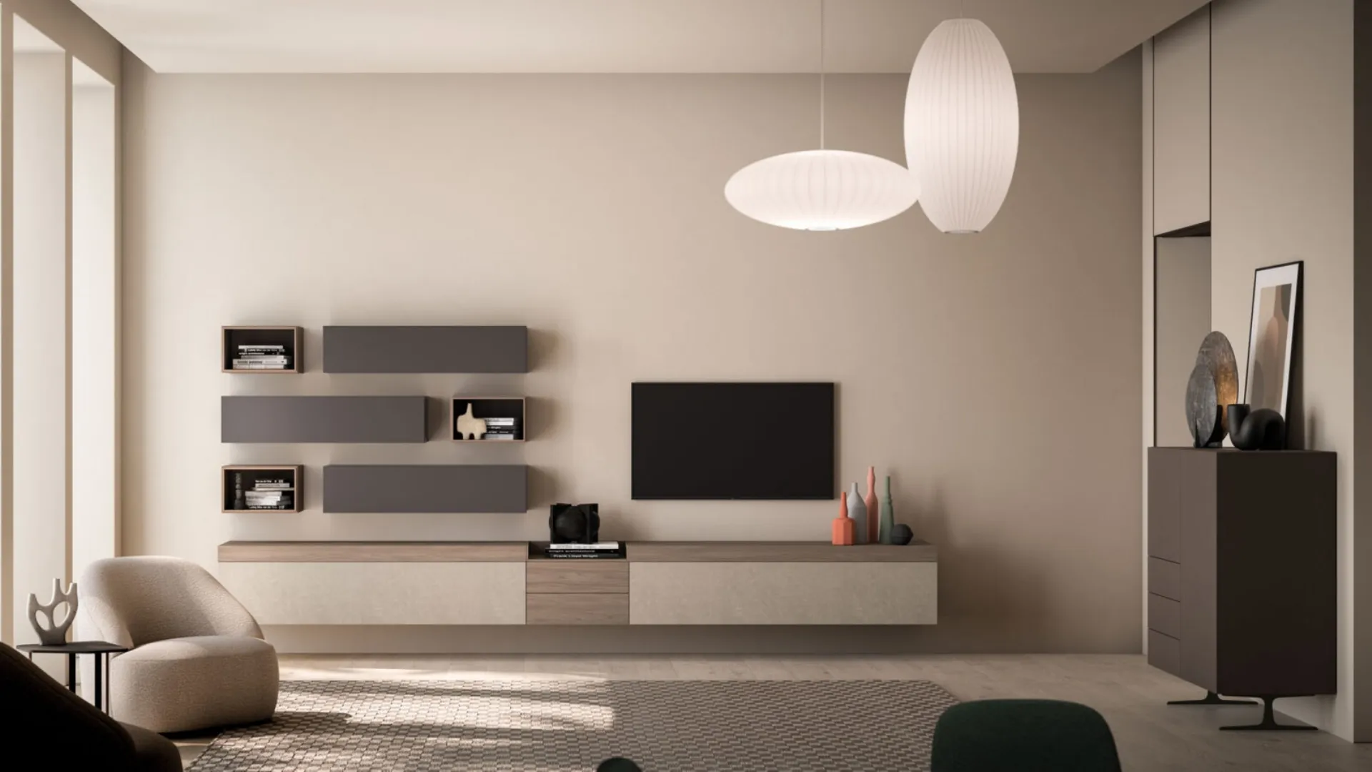 Vuoi allestire un soggiorno pratico e dinamico? Ecco a te la parete attrezzata Modulo Day 06 Orme dalle linee decise moderne.