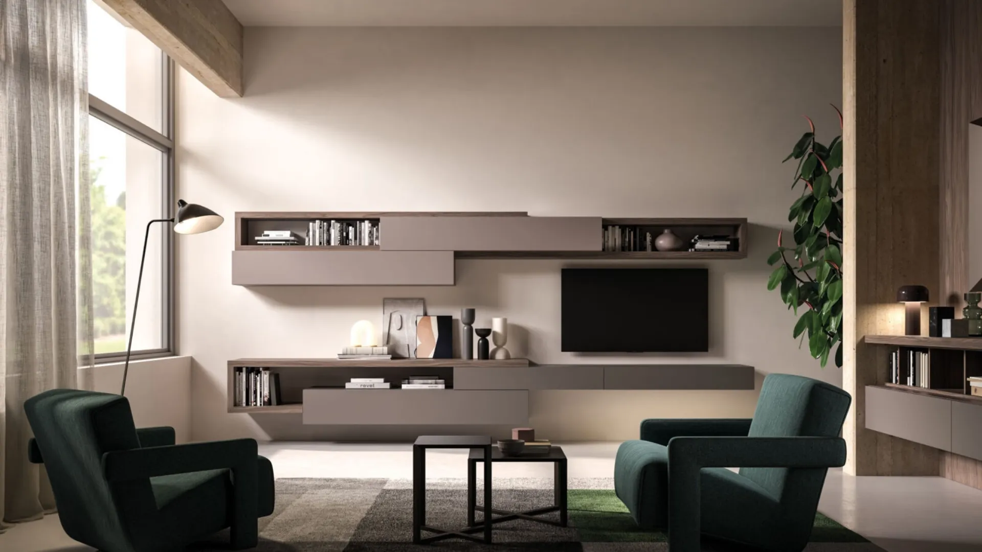 Vuoi allestire un living dinamico e operativo? Ti presentiamo la parete attrezzata Modulo Day 12 Orme dalle linee decise moderne.