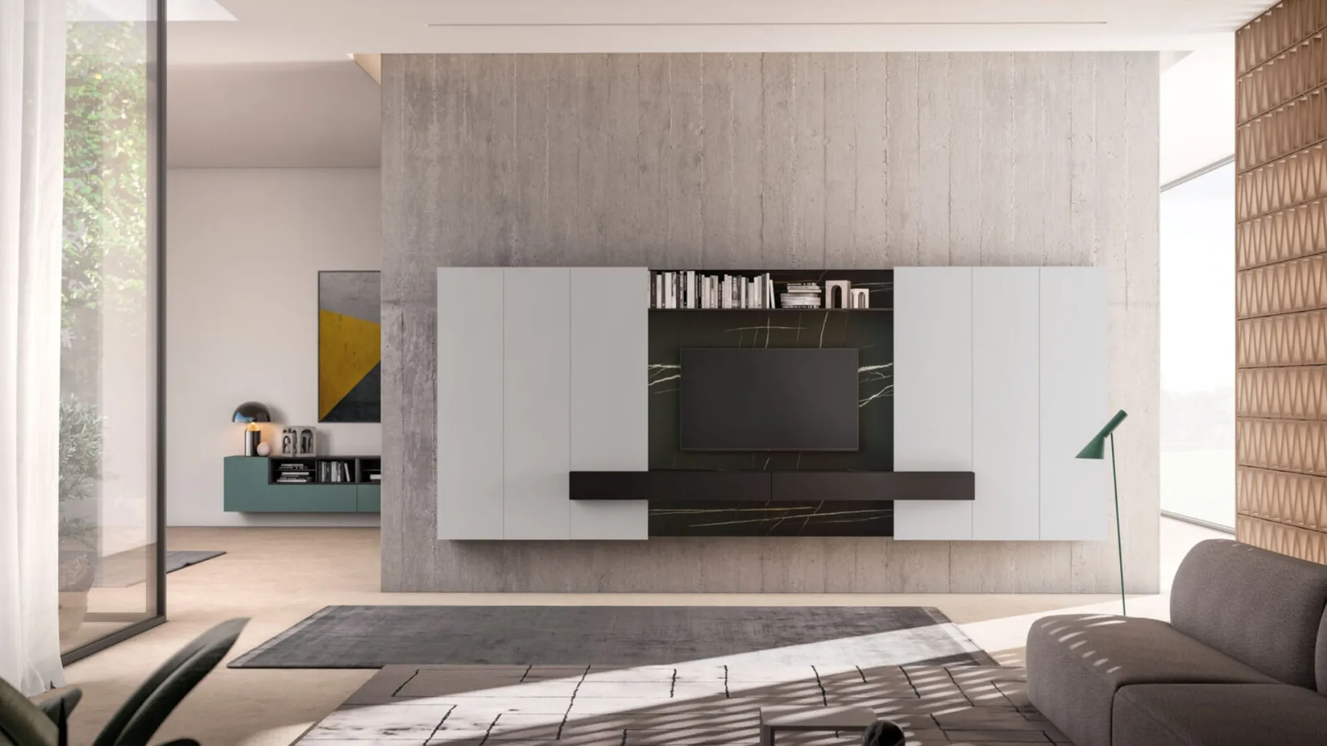 Vuoi ammobiliare un living pratico e dinamico? Ecco a te la parete attrezzata Modulo Day 19 Orme dalle forme decise moderne.