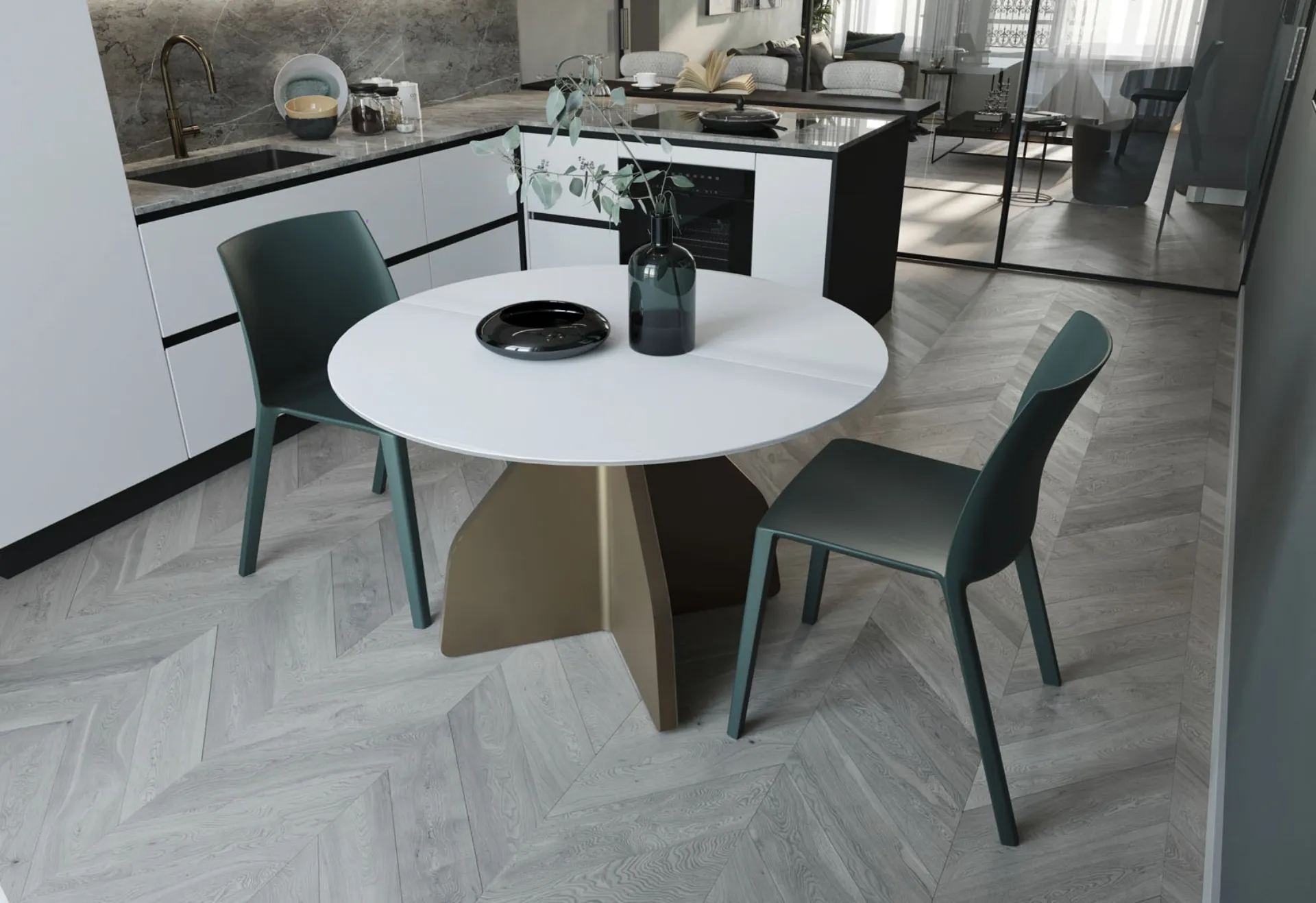 Tavolo rotondo allungabile Wing in ceramica bianco assoluto di Zamagna: con questo modello potrai impreziosire spazi moderni assicurandoti componibilità personalizzabile e la massima personalizzazione dei tavoli allungabili. La scelta dei Tavoli da cucina è fondamentale se desideri completare il proprio Arredamento Casa: sono da verificare gli spazi disponibili, gli accostamenti cromatici e le finiture. In showroom troverai un ricco catalogo di mobili e complementi in ceramica dei migliori produttori, ideali per completare i tuoi spazi.