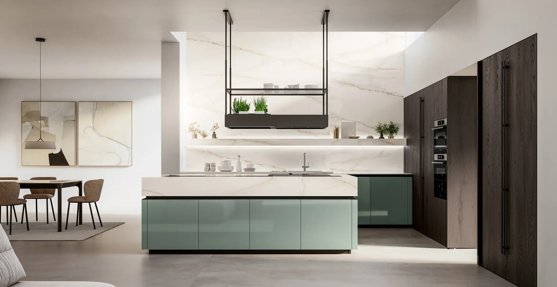 Clicca e scopri un universo di Cucine Moderne con isola: la cucina Time 04 Arredo3 in laccato lucido ti attende!