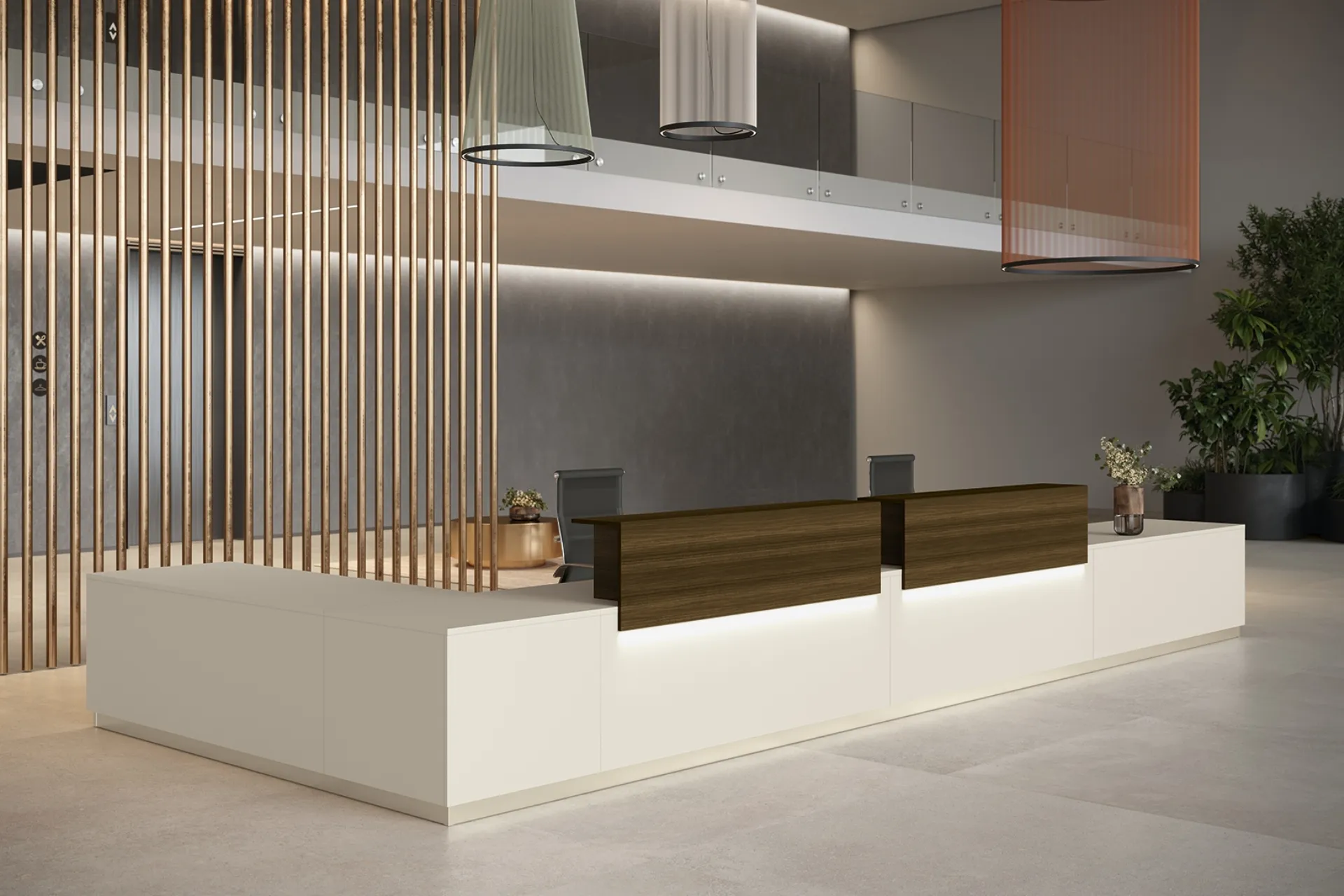 Cerchi Arredo Ufficio dei migliori produttori? Scopri le differenti soluzioni di banconi reception in melaminico, come il modello Reception Class 06 di Colombini Office.