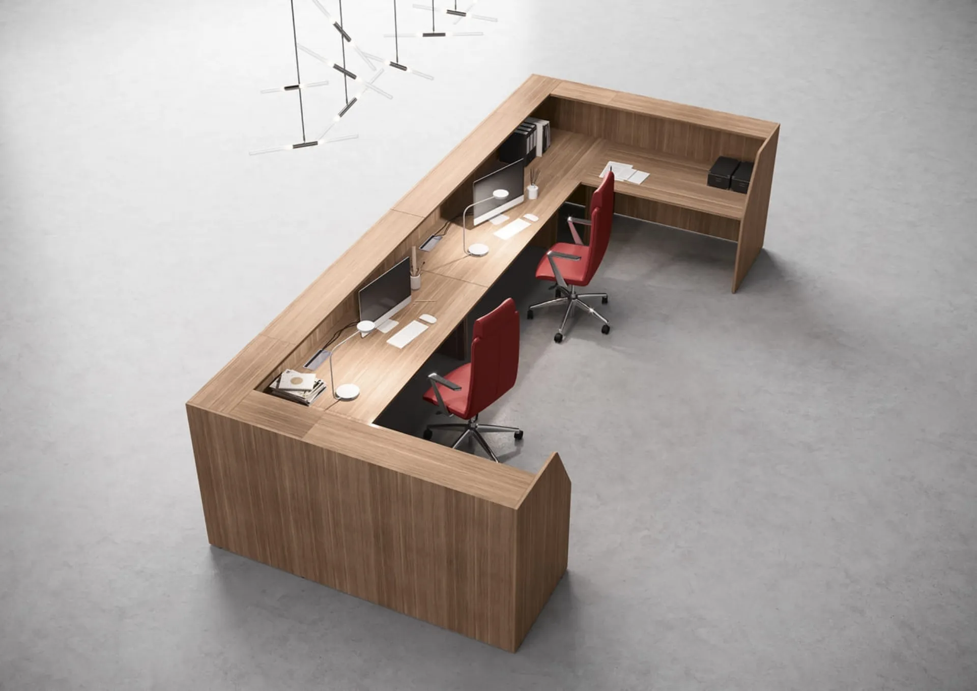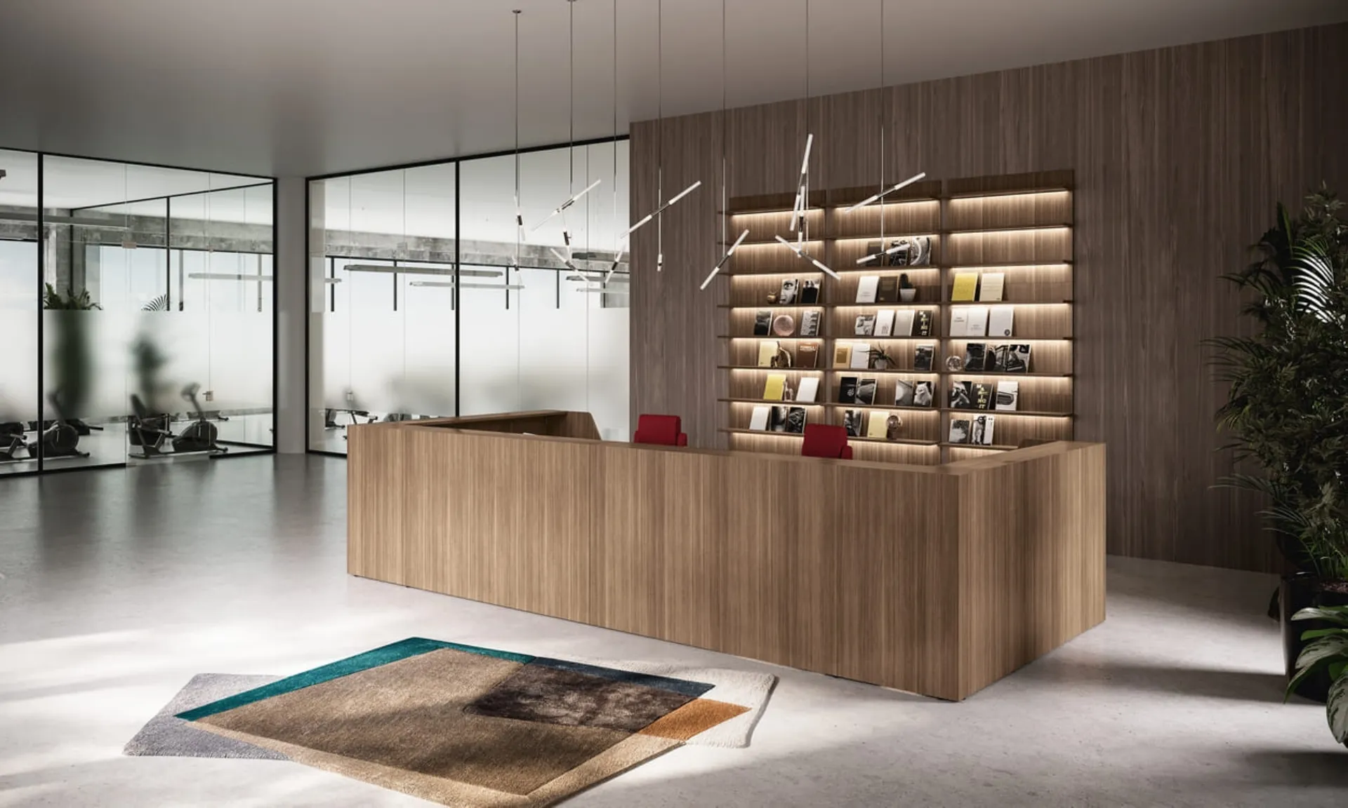 Vuoi ammobiliare uffici operativi e direzionali? Eccoti differenti proposte di banconi reception in melaminico, come il modello Reception Noce a Golfo di Compir.